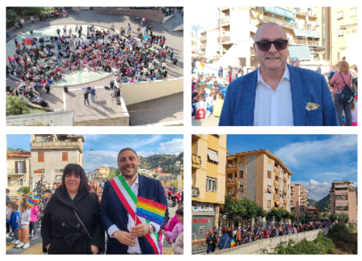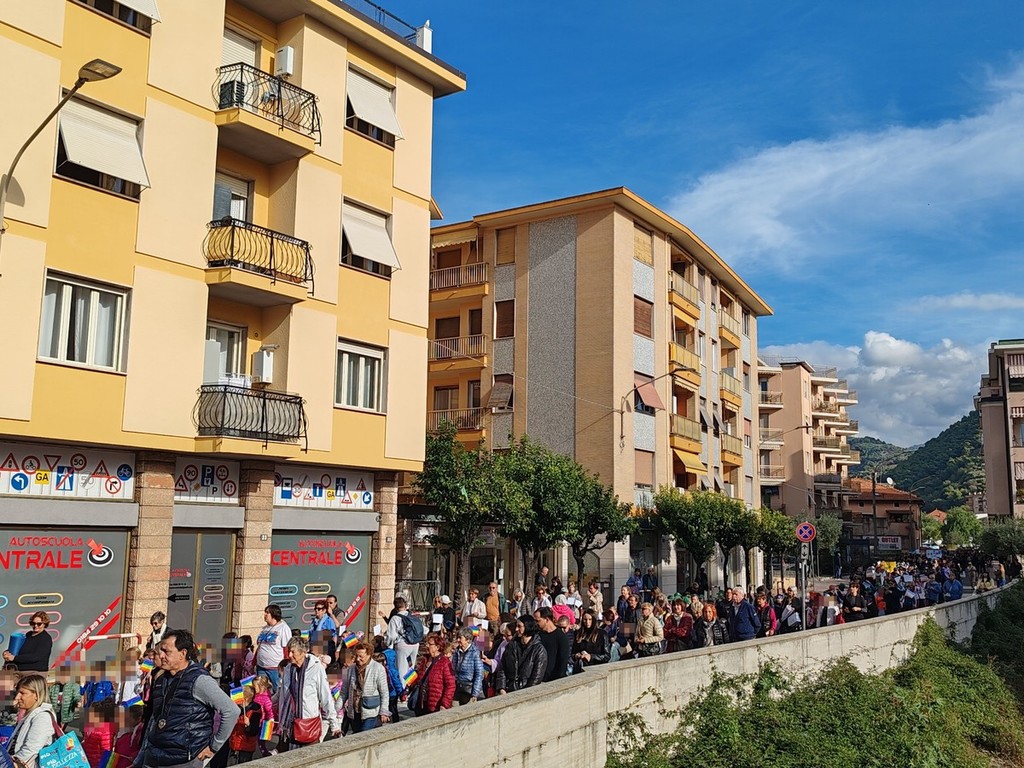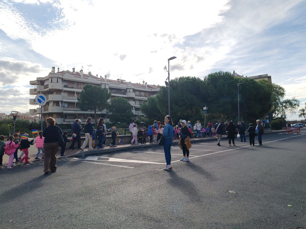 Alla manifestazione hanno partecipato anche il vicesindaco Cristian Quesada e il consigliere comunale Manuela Balbis, raggiunti poi sul solettone dal sindaco Fabio Perri, i carabinieri, la polizia di Stato e la polizia locale, che ha veicolato il traffico per consentire in totale sicurezza il passaggio del corteo, e la Protezione civile. "Ringraziamenti doverosi vanno al sindaco Fabio Perri, al vicesindaco Cristian Quesada e all’assessore alla pubblica istruzione Rosella Rosa Muratore per aver condiviso con noi il progetto, al comandante della polizia locale D’Agostino, al luogotenente Mura, al dirigente del commissariato di pubblica sicurezza di Ventimiglia, il vicequestore Arena, all'assistente capo e coordinatore della polizia di Stato nella persona di Marcello Cabizzosu, non solo per aver garantito e vigilato sulla nostra sicurezza ma anche per aver testimoniato che le istituzioni non sono entità lontane ma parte viva della comunità, alle associazioni Le Cinque Torri e Marinai d’Italia per la preziosissima presenza e collaborazione, a tutti i genitori, di oggi e di allora, per saper rispondere sempre con entusiasmo e senza esitazione alle nostre proposte trovando il tempo di lavorare con noi alla preparazione e alla realizzazione delle iniziative; all’impresa edile Aime G. per aver regalato ai nostri ragazzi, senza esitazione, alcuna 100 mt di rete arancione da cantiere che ci ha permesso di dimostrare che vogliamo essere costruttori di pace e, infine, un grande grazie va a tutti noi che partecipiamo tutti i giorni a costruire pace" - sottolinea - "Questa giornata è stata possibile perché tutti noi abbiamo saputo costruirla insieme. Ogni ruolo, ogni contributo, ogni presenza è stata essenziale uniti attorno a un'idea semplice ma potente: vale la pena seminare pace anche quando il mondo sembra andare nella direzione opposta. Forse è questo il messaggio più profondo che abbiamo consegnato ai nostri seicento ragazzi: che insieme si può, che una comunità unita può fare grandi cose, che la pace non è un'utopia da sognare ma un impegno concreto da vivere e che, forse un giorno, quel che stiamo seminando oggi germoglierà in un mondo più giusto e pacifico".