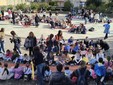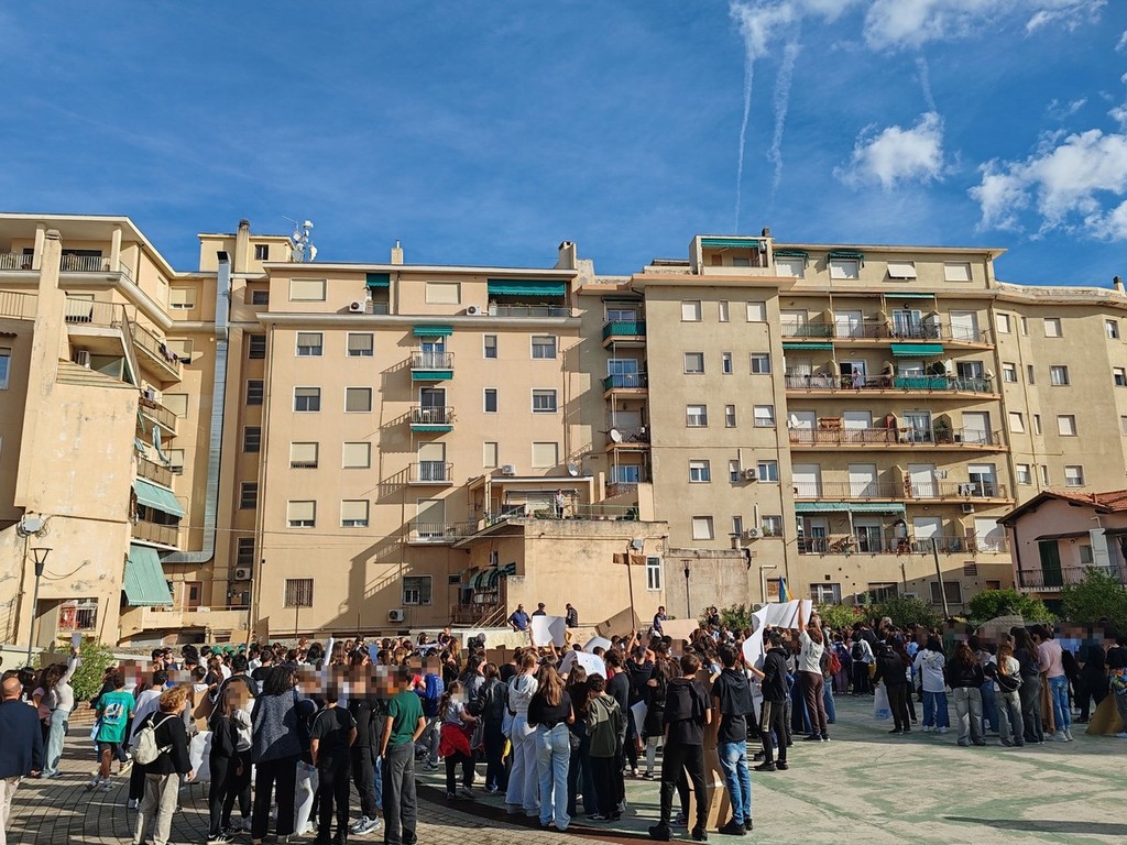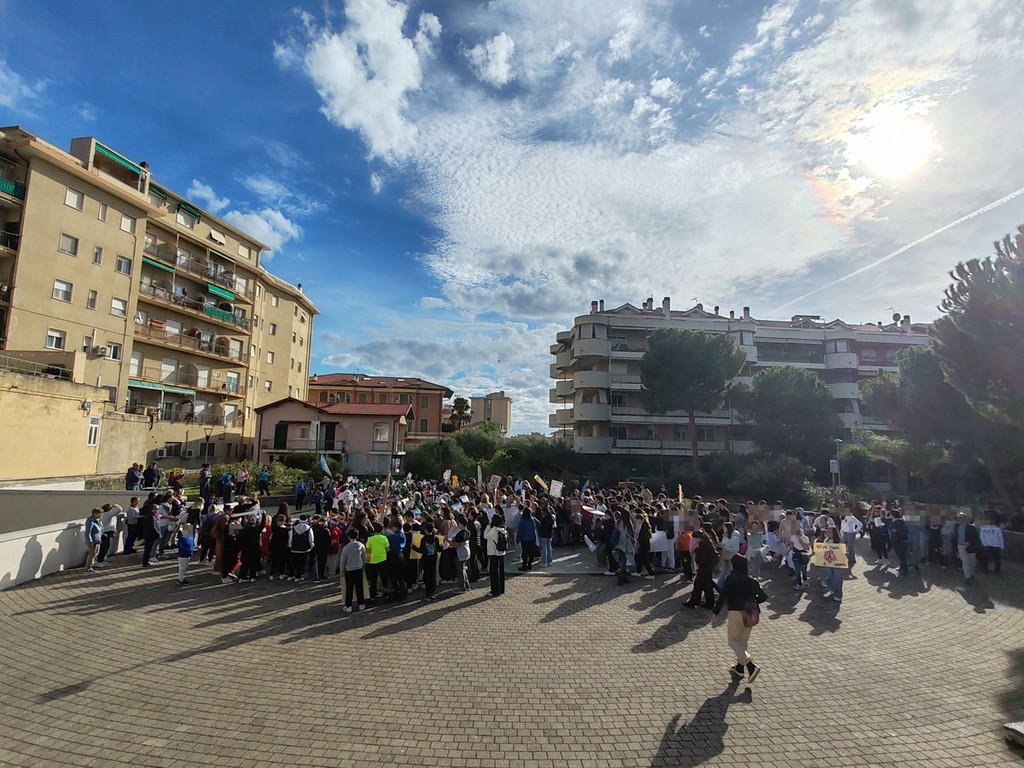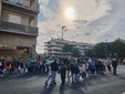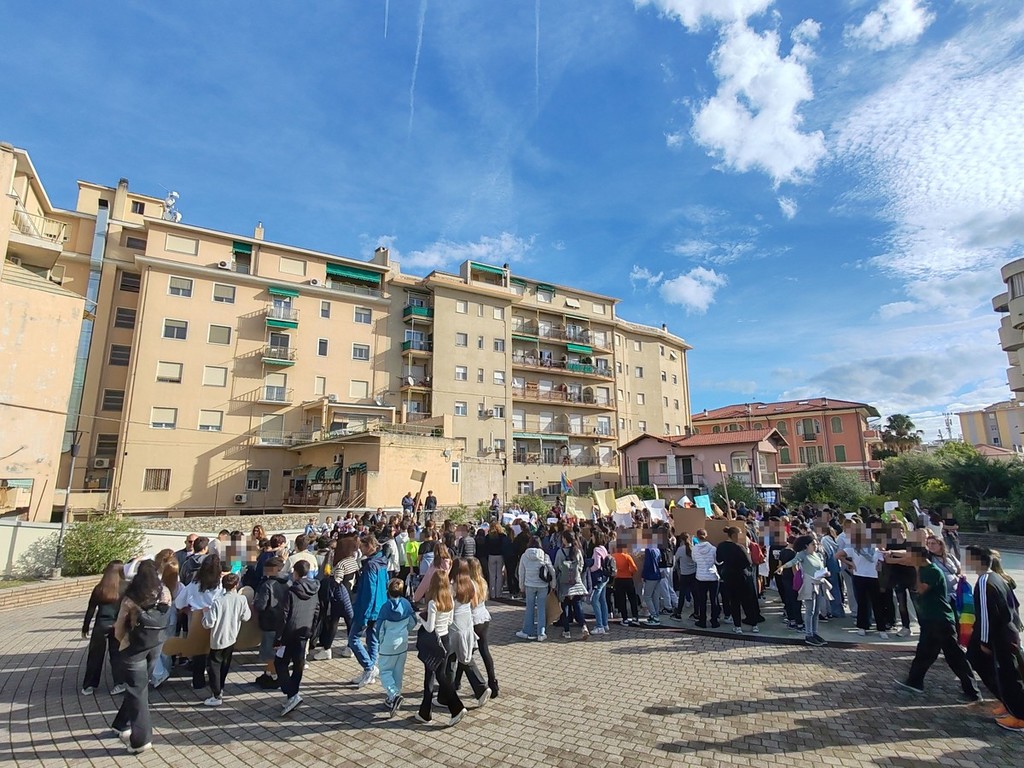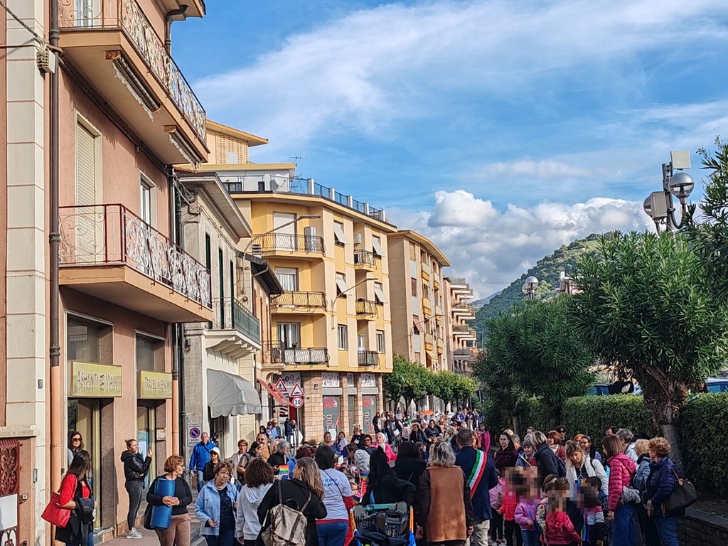 In marcia per la pace. Alunni di tutti gli ordini e plessi dell'istituto comprensivo A. Doria, docenti e collaboratori scolastici, questa mattina, hanno marciato dalla scuola fino alla pista di pattinaggio sul solettone sud attraversando via Roma, scortati dalla polizia locale e dalla polizia di Stato, con bandierine, cartelloni e striscioni.