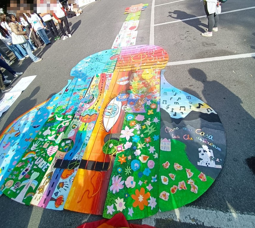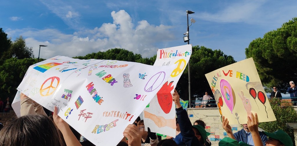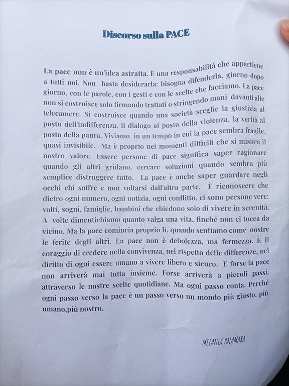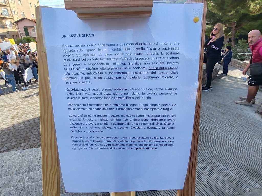 "Spesso pensiamo alla pace come a qualcosa di astratto o di lontano, che riguarda solo i grandi leader mondiali ma la verità è che la pace inizia proprio qui, con noi. La pace non è solo stare tranquilli. È costruire qualcosa di bello e forte tutti insieme. Costruire la pace è un atto quotidiano di impegno e responsabilità collettiva. Significa non lasciare indietro nessuno, accogliere tutte le prospettive e dedicarsi, pezzo dopo pezzo, alla paziente, meticolosa e fondamentale costruzione del nostro futuro comune. La pace è un puzzle: per completarlo, dobbiamo lavorare, e sognare, insieme" - viene detto durante la manifestazione - "Guardate questi pezzi: ognuno è diverso. Ci sono colori, forme e angoli unici. Nella vita, questi pezzi siamo noi: siamo le diverse persone, le diverse culture, le diverse idee e i diversi paesi del mondo. Per costruire l'immagine finale abbiamo bisogno di ogni singolo pezzo. Se ne lasciamo fuori anche solo uno, l'immagine rimane incompleta e fragile. La vera sfida non è trovare il pezzo ma capire come incastrarlo con quello accanto. A volte un pezzo sembra non andare bene: dobbiamo avere pazienza e provare a girarlo, a guardarlo da un altro punto di vista. Questo, nella vita, si chiama dialogo e ascolto. Dobbiamo rispettare la forma dell'altro, senza forzarla. Quando i pezzi si incastrano bene, creano una struttura solida. La pace è proprio questo: trovare i punti di contatto, rispettare le differenze e creare connessioni forti. Quindi, oggi lavoriamo insieme, dialoghiamo e rispettiamo ogni pezzo. Stiamo costruendo il nostro piccolo puzzle di pace".