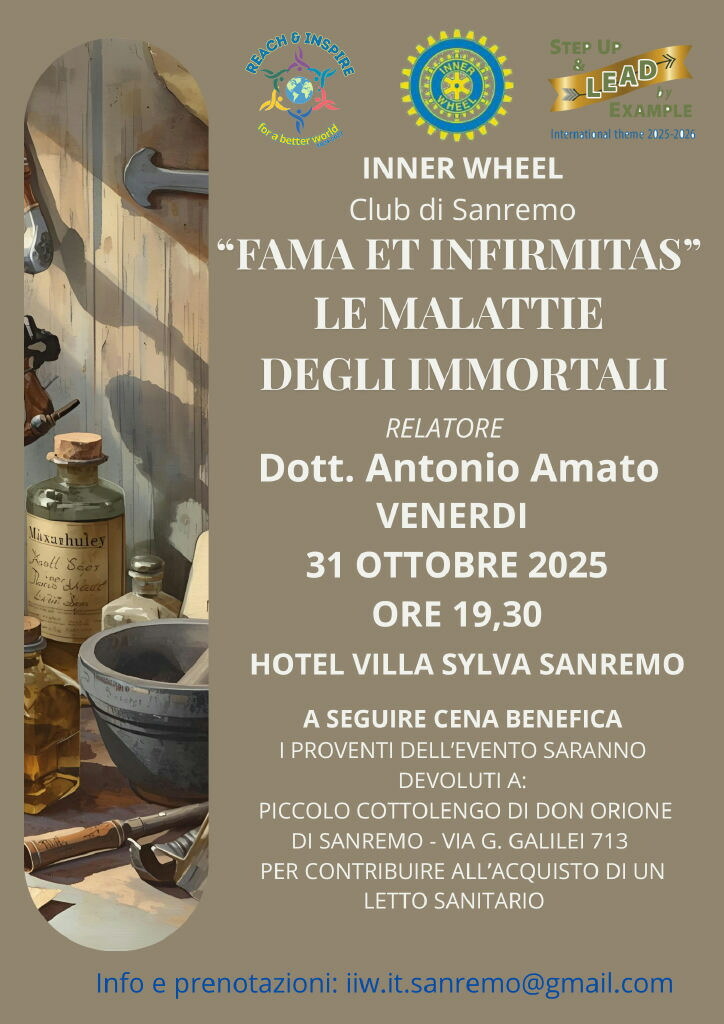 “Un viaggio libero nelle vicende cliniche di alcuni personaggi celebri”, spiega la Presidente del Club, Marina Remaggi, “che da un lato esplora pagine affascinanti e sorprendenti di storia della medicina e dall’altro mostra come le vicissitudini sanitarie abbiano influito sulla loro vita biografica e pubblica”. Al termine dell’intervento scientifico-culturale, gli ospiti saranno invitati a partecipare a una cena benefica. L’intero ricavato sarà devoluto al Piccolo Cottolengo di Don Orione di Sanremo, con l’obiettivo di contribuire all’acquisto di un letto sanitario destinato agli ospiti della struttura.