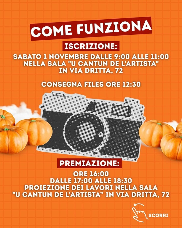 Tutti potranno liberamente aderire al concorso fotografico organizzato dall'associazione Controluce. "Chi fosse interessato potrà iscriversi dalle 9 alle 11 nella sala 'U cantun de l'artista' in via Dritta 72. I partecipanti dovranno fare scatti in giro per il centro storico secondo il tema: 'Vallecrosia è bella, ficcatelo in zucca!'" - fa sapere Gerry Salerno, fotografo e fondatore dell'associazione Controluce - "Ogni partecipante dovrà consegnare tre files alle 12.30. Gli scatti più belli e originali verranno selezionati da una giuria e poi verranno premiati alle 16 a Vallecrosia Alta. Inoltre, dalle 17 alle 18.30 tutti i lavori realizzati durante la giornata verranno proiettati nella sala 'Un cantun de l'artista' in via Dritta 72".