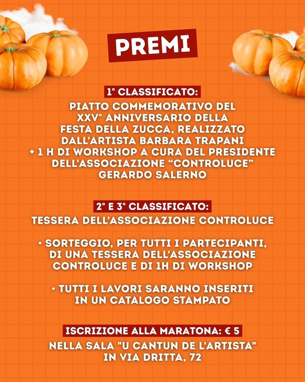 Per i vincitori sono previsti diversi premi. Il primo classificato riceverà un piatto commemorativo del XXV anniversario della Festa della Zucca, realizzato dall'artista Barbara Trapani, e un'ora di workshop con il presidente dell'associazione Controluce Gerry Salerno; al secondo e terzo classificato, invece, verrà consegnata la tessera dell'associazione Controluce. "Tutti i partecipanti, a sorteggio, potranno ottenere una tessera dell'associazione Controluce e un'ora di workshop" - svela Salerno - "Inoltre, tutti i lavori saranno inseriti in un catalogo stampato".