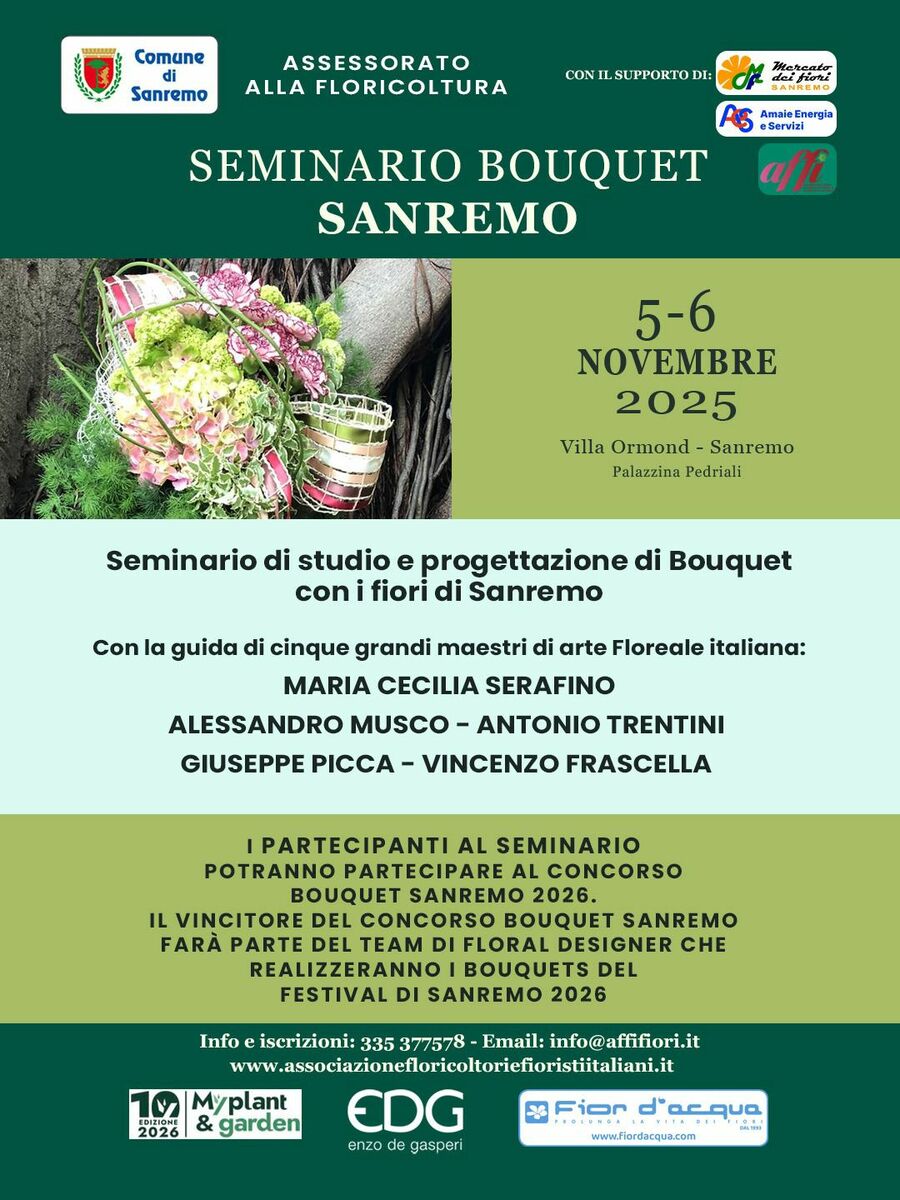 Al seminario parteciperanno 40 fioristi provenienti da tutta Italia che affronteranno, come tema principale, il confezionamento di bouquet scegliendo natura, dimensioni e colori di prodotti tipici sanremesi, affinché vengano poi disposti con arte e creatività. I partecipanti al seminario potranno iscriversi al concorso 'Bouquet Sanremo 2026' e il vincitore del concorso farà parte del team che realizzerà i bouquet per il Festival di Sanremo 2026.