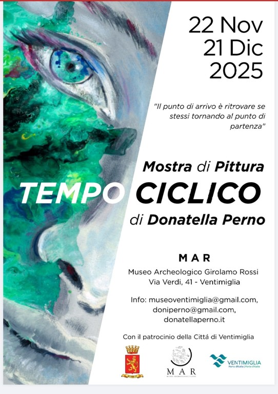 "Tempo ciclico" di Donatella Perno in mostra al Mar di Ventimiglia. Dal 22 novembre al 21 dicembre sarà, infatti, possibile scoprire e ammirare le opere di pittura realizzate dall'artista e pittrice sanremese che verranno allestite al museo archeologico Girolamo Rossi.