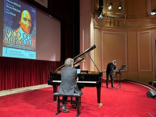 Le musiche, scelte e interpretate al pianoforte da Nicolosi, hanno accompagnato il racconto alternando Marcello, Scarlatti, Respighi, Martucci e Castelnuovo-Tedesco, creando un dialogo costante tra filosofia, poesia e tradizione classica. Un’ora e dieci minuti di spettacolo che hanno intrecciato storia e sentimento, dall’ispirazione creatrice della Provvidenza al ruolo fondativo dei miti nella nascita delle civiltà, temi fondamentali della riflessione di Vico.