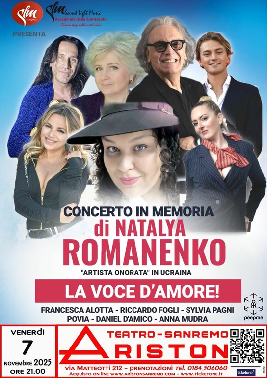 7 novembre alle ore 21.00 sul palco del teatro Ariston si terrà un concerto in memoria della cantante ucraina Natalya Romanenko, insignita del titolo di Artista Emerita dell'Ucraina. Purtroppo Natalia ha lasciato questo mondo troppo presto, senza riuscire a realizzare tutti i suoi sogni.