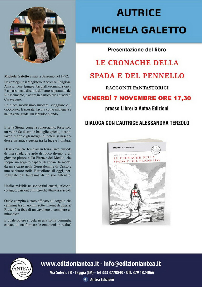 Venerdì 7 novembre alle ore 17.30 presso la sede della Casa Editrice Antea Edizioni di Angelo Giudici, in via Soleri 5B a Taggia si terrà la presentazione del libro Le Cronache della Spada e del Pennello di Michela Galetto.