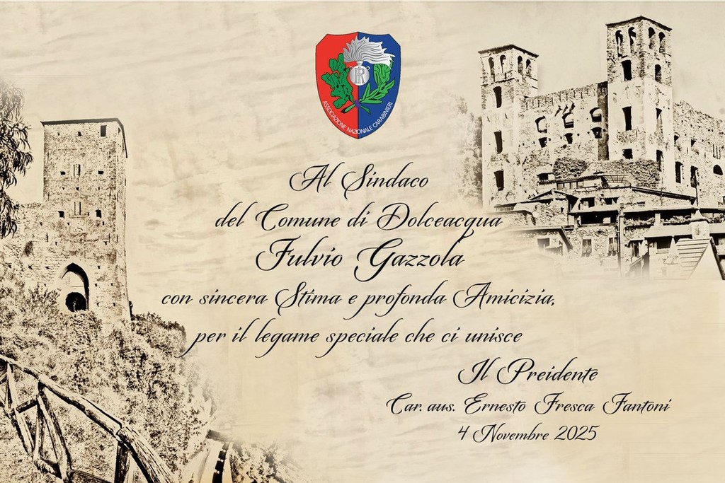 I presenti hanno onorato i caduti delle grandi guerre e delle forze armate in missioni di pace con un corteo, partito dall'ex palazzo comunale, la deposizione di corone d'alloro e una santa messa. L’Amministrazione comunale, per l'occasione, ha invitato come relatore ufficiale Ernesto Fresca Fantoni, presidente dell'associazione nazionale carabinieri di Ventimiglia sezione Medaglia d'oro Antonio Fois, che ha, inoltre, consegnato una targa al sindaco di Dolceacqua Fulvio Gazzola. "Il comune di Dolceacqua è stato tra i primi in Liguria, nel 2014, a conferire la cittadinanza onoraria all'Arma dei carabinieri" - dice Ernesto Fresca Fantoni, presidente dell'Anc di Ventimiglia che ha reso omaggio all’Arma dei Carabinieri in occasione della ricorrenza del 4 novembre. - "Inoltre, uno speciale e profondo rapporto lega il sindaco di Dolceacqua Fulvio Gazzola alla nostra associazione, per questo motivo, con sincera stima e profonda amicizia, abbiamo deciso di consegnargli una targa".