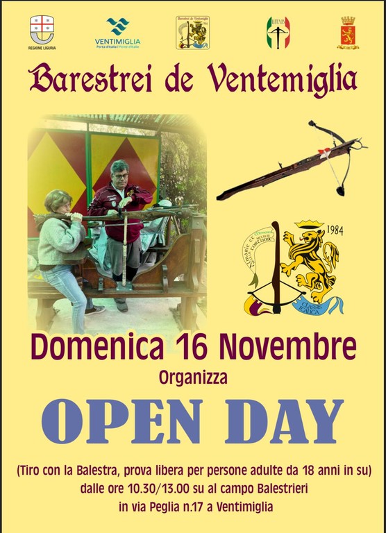 Un'occasione unica per gli adulti, dai 18 anni in su, che potranno così conoscere e provare l'antica arma da lancio. "Vi aspettiamo per una prova libera domenica 16 novembre" - dicono i balestrieri - "Si terrà, anche in caso di pioggia, presso la sede in via Peglia 17 a Ventimiglia, dove vi è la sede e il campo di tiro. Si può contattare Mimmo Miceli, maestro d'armi al 3498412920".