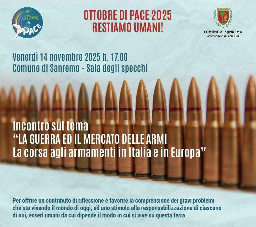 Si concluderà venerdì prossimo alle 17, nella Sala degli Specchi del Comune di Sanremo, la ventesima edizione dell’Ottobre di Pace, la rassegna promossa da una rete di associazioni cittadine che ogni anno invita alla riflessione sui temi della pace, della nonviolenza e dei diritti umani. A vent’anni dalla nascita dell’iniziativa, il percorso di quest’anno si chiude con un incontro di grande attualità dal titolo “La guerra e il mercato delle armi”, un tema che interpella profondamente la coscienza civile in un momento storico segnato da nuovi conflitti, da una crescente spesa militare e da un preoccupante ritorno alla logica della forza.