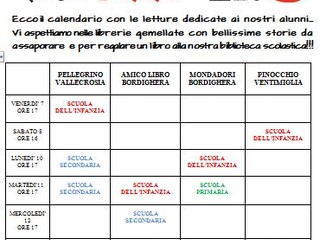 Le letture in libreria per il progetto nazionale #ioleggoperché continuano. Oggi, giovedì 13 novembre, alle 17, è previsto un incontro per la scuola dell'infanzia da Amico Libro a Bordighera mentre da Pinocchio a Ventimiglia per la scuola primaria. Venerdì 14 novembre alle 17 da Pellegrino vi sarà un appuntamento per la scuola primaria mentre alla Mondadori a Bordighera per la scuola dell'infanzia. Sabato 15 novembre, invece, alle 10.30 da Pellegrino vi sarà un incontro per la scuola dell'infanzia, da Amico Libro a Bordighera per la scuola primaria mentre da Pinocchio a Ventimiglia per la scuola secondaria. Fino al 16 novembre si potranno, inoltre, donare libri alla scuola recandosi in diverse librerie: Pellegrino a Vallecrosia, Amico Libro a Bordighera, Mondadori a Bordighera e Pinocchio a Ventimiglia.