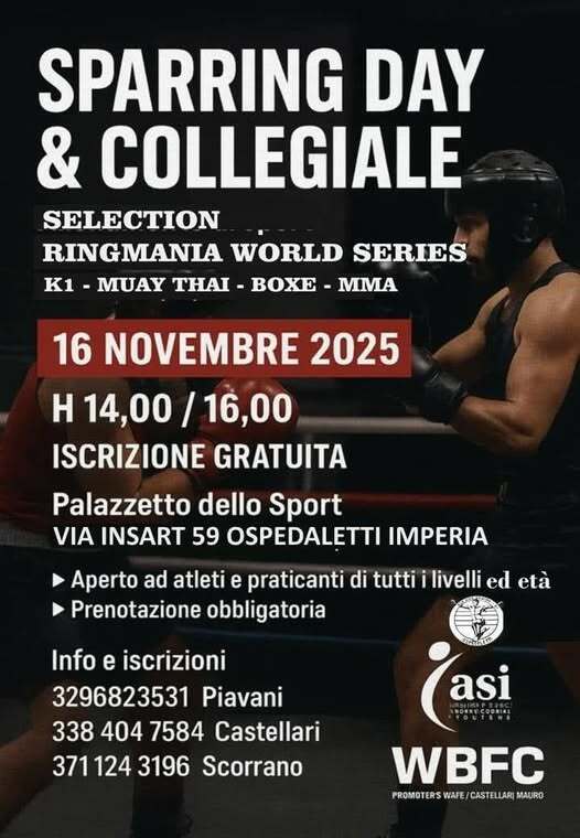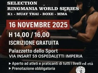 Il Palazzetto dello Sport di via Isnart domenica dalle 14 alle 16 ospita una Selezione Ringmania World Series K1/Muay Thai/Boxe/MMA, importante evento dedicato agli sport da combattimento. Organizzato dalla WBFC (World Boxing Fighters Corporation) del presidente Franco Scorrano – responsabile nazionale ASI degli sport da combattimento moderno – e dal vice-presidente Alessandro Piavani, con la fondamentale collaborazione locale del Maestro Mauro Castellari di Ospedaletti. La manifestazione, di grande interesse sia per i praticanti che per i profani in materia, è ad ingresso completamente libero e gratuito, sia per gli atleti che per il pubblico, ed è aperta a praticanti di tutte le età e di tutti i livelli.
