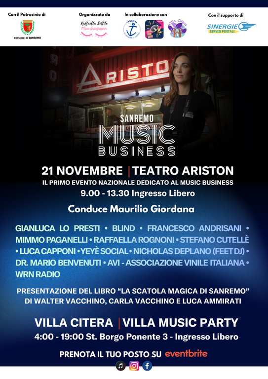 Si terrà a Sanremo, il 21 novembre 2025 presso il Teatro Ariston, la quarta edizione di Sanremo Music Business, una mattinata formativa dedicata all’esplorazione del dietro le quinte del music business nell’epoca dell’intelligenza artificiale condotta da Maurilio Giordana. L’evento è rivolto a studenti, operatori culturali, professionisti del settore, docenti e appassionati che desiderano comprendere le dinamiche contemporanee dell’industria musicale, della comunicazione e dello spettacolo in un momento storico caratterizzato da trasformazioni rapide e profonde.