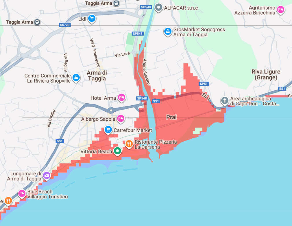 Arma di Taggia: il mare si prenderebbe il Prai, la Darsena e il nuovo ponte. La situazione più critica del Ponente riguarda Arma di Taggia. Qui, l’innalzamento del mare di tre metri inghiottirebbe quasi tutta la zona costiera, dal Prai fino al lungomare di Levà. Le acque sommergerebbero la Darsena, il ponte nuovo in costruzione e parte del Carrefour Market, spingendosi fino agli argini del torrente Argentina. L’effetto sarebbe devastante: il mare penetrerebbe nell’entroterra, trasformando la parte bassa di Arma in una distesa d’acqua salmastra.