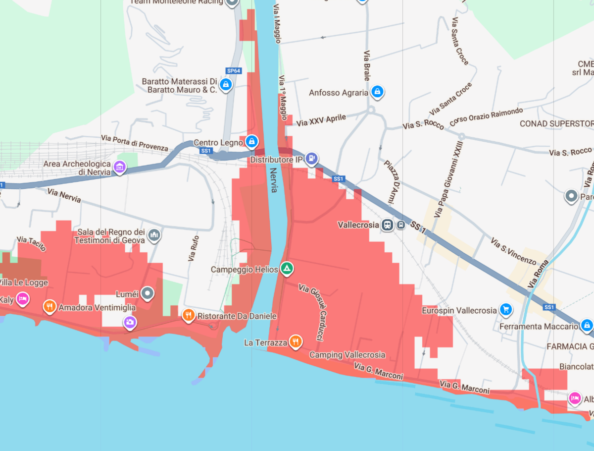 Vallecrosia: il Nervia si allargherebbe, cancellando il lungomare. Più a ovest, Vallecrosia pagherebbe un prezzo altissimo. La mappa mostra un’espansione impressionante del torrente Nervia, che esonderebbe oltre gli argini, allagando il Camping Vallecrosia, il Lungomare Marconi, il tratto costiero fino a via Roma e parte delle aree commerciali (incluso l’Eurospin). L’acqua arriverebbe fino al Conad Superstore e si estenderebbe verso via S. Rocco, tagliando in due la città.