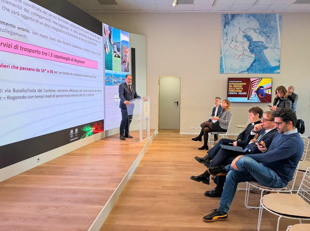Quattordici treni giornalieri in più sulla linea Genova-Milano con servizio in cinque stazioni del nodo di Milano: Centrale, Lambrate, Rogoredo, Forlanini e Greco Pirelli, quasi raddoppiati i posti offerti e ampliamento della fascia oraria tra le due regioni dalle 5.36 alle 22.05. Queste le principali novità presentate oggi dall’assessore regionale ai Trasporti Marco Scajola e dal direttore regionale di Trenitalia Tiziano Savini in merito all’annunciato potenziamento, con conseguente cadenzamento orario, del servizio ferroviario tra Genova e Milano. Alla conferenza stampa era presente anche il presidente di Assoutenti Liguria Furio Truzzi in rappresentanza delle associazioni dei consumatori.