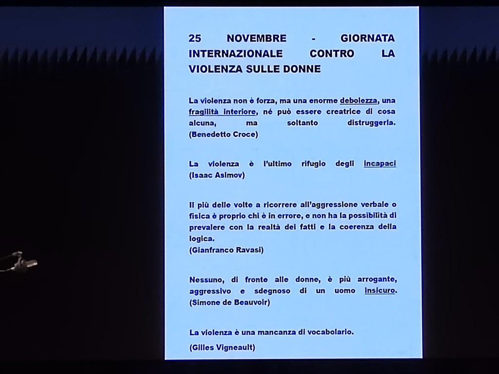 Un'iniziativa promossa dal Comune e dalle scuole del territorio in occasione della giornata Giornata internazionale per l'eliminazione della violenza contro le donne. Per l'occasione sono intervenuti numerosi relatori e rappresentanti del mondo istituzionale e culturale come il sindaco Flavio Di Muro, l'assessore Milena Raco, il dirigente del commissariato di Ventimiglia, il vicequestore Paolo Arena, tra loro il vice sovrintendente della Polizia di Stato Tiziana Cavalleri, l’Arma dei Carabinieri, la criminologa Flavia Fiumara, la coordinatrice del Centro Antiviolenza ISV Roberta Rota, l’avvocato Paola Viviani, presidente della Commissione Pari Opportunità del Tribunale di Imperia, la direttrice dell’Istituto internazionale di studi liguri Daniela Gandolfi e la dirigente scolastica dell'istituto comprensivo “Cavour” Antonella Costanza.