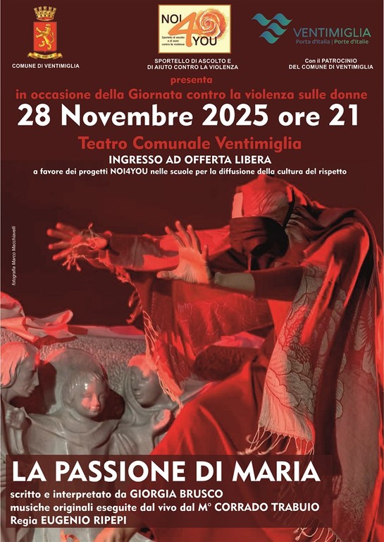 Uno spettacolo solidale andrà in scena al teatro comunale di Ventimiglia il 28 novembre alle 21 in occasione della Giornata contro la violenza sulle donne. Si tratta de "La passione di Maria", scritto e interpretato da Giorgia Brusco con la regia di Eugenio Ripepi e musiche originali eseguite dal vivo dal maestro Corrado Trabuio.