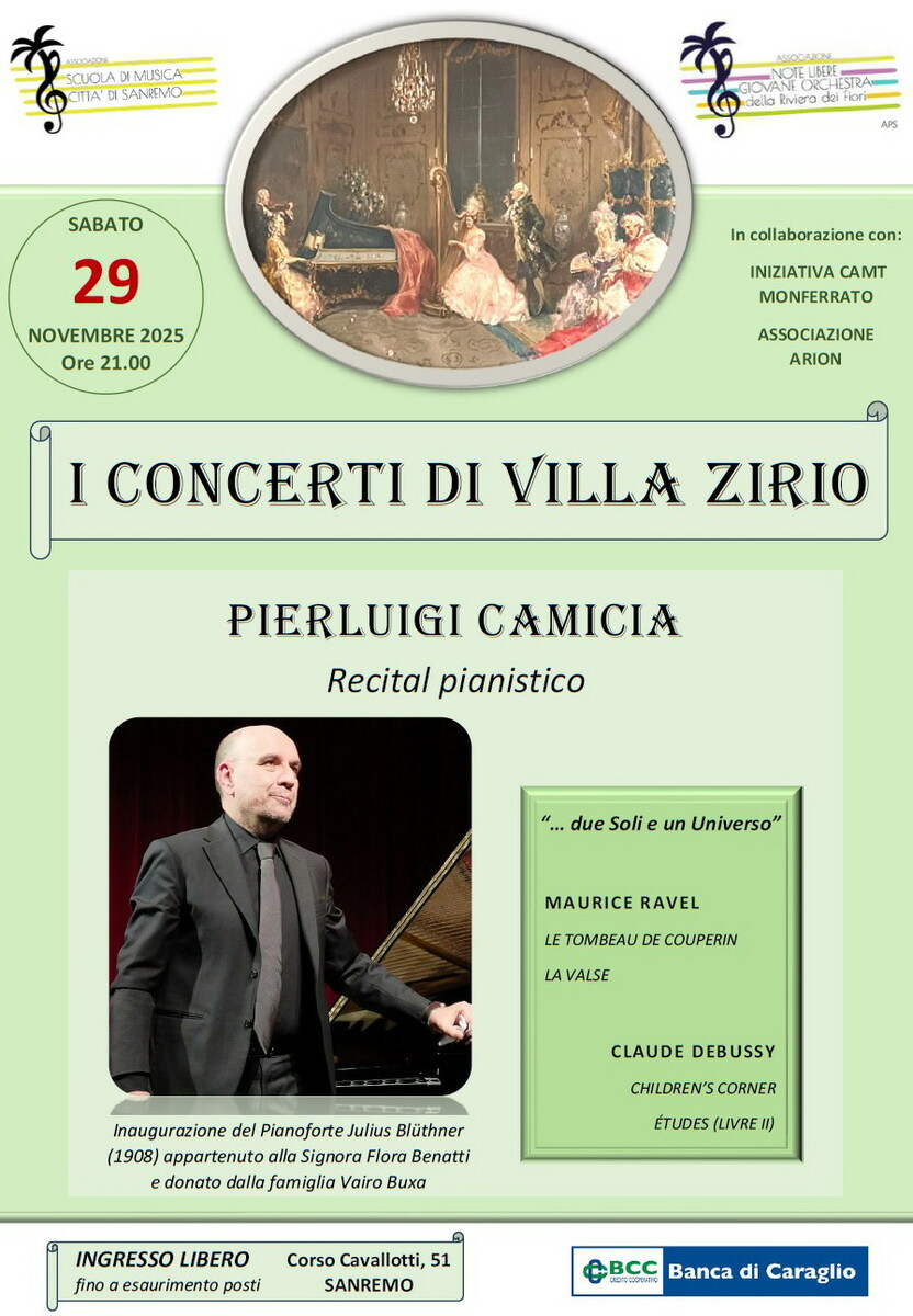 Sabato 29 novembre alle ore 21.00 presso il Salone Verdi di Villa Zirio si terrà un Concerto del pianista Pierluigi Camicia intitolato “… due Soli e un Universo”. Il Concerto, organizzato dall’Associazione Note Libere (APS) in collaborazione con l’Associazione Scuola di Musica Città di Sanremo è dedicato a Maurice Ravel e Claude Debussy. Sarà inaugurato il Pianoforte Julius Blüthner (1908) appartenuto alla Signora Flora Benatti e donato dalla famiglia Vairo Buxa.
