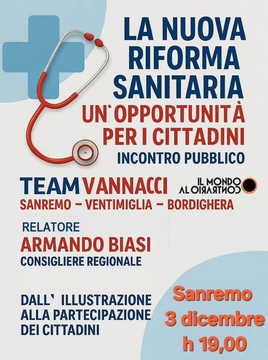 Un incontro aperto alla cittadinanza per fare chiarezza, senza formalismi né slogan. È questo lo spirito della serata dedicata alla nuova riforma sanitaria regionale, in programma il 3 dicembre alle 19 presso il Grand Hotel & Des Anglais di Sanremo, in Corso Imperatrice 134. Al centro dell’appuntamento ci sarà un tema che tocca da vicino la vita quotidiana dei cittadini: come cambieranno, concretamente, i servizi sanitari sul territorio. A guidare l’analisi sarà Armando Biasi, consigliere regionale, che illustrerà con un linguaggio diretto i punti principali della riforma, gli obiettivi dichiarati e le ricadute attese sulle comunità locali.