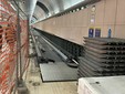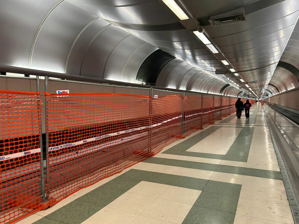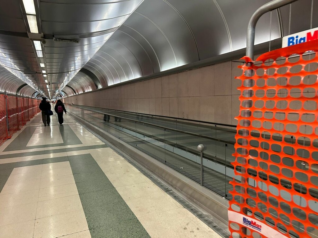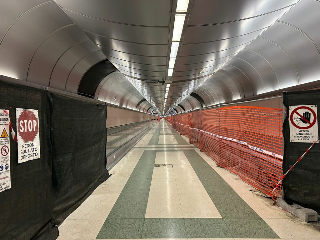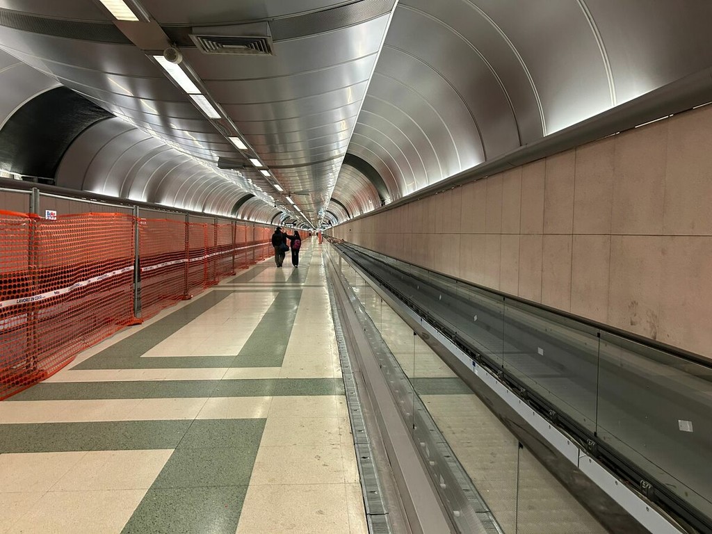Nelle due estremità dell’area in direzione dei treni – lato destro e lato sinistro del tunnel – i nuovi impianti sono ormai assemblati e immediatamente riconoscibili. Sul lato destro i tapis roulant sono praticamente completi, mancano solo alcune ultime rifiniture e installazioni minori. I corrimano sono già posizionati e la linea è stata chiusa quasi totalmente.