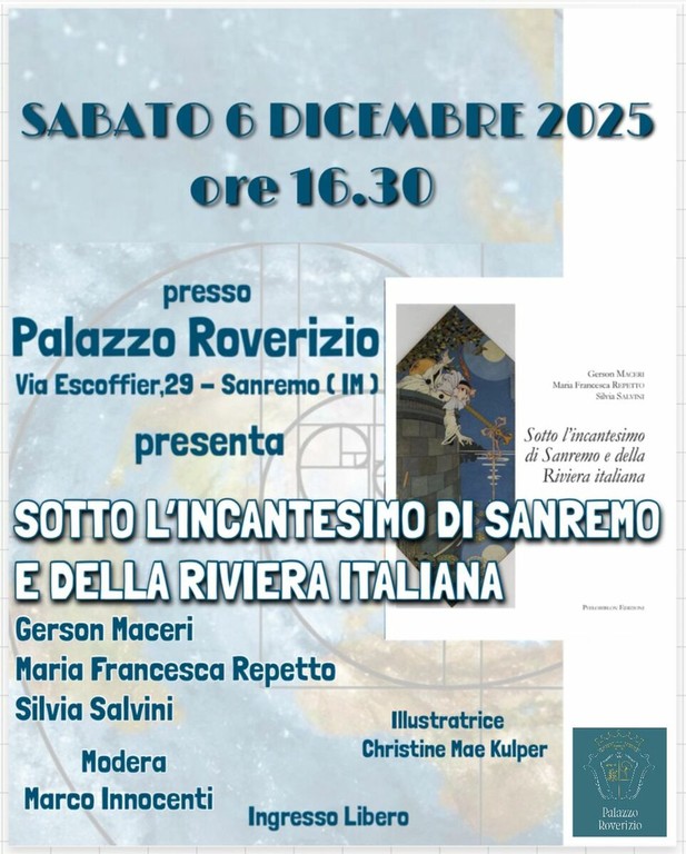 Sabato 6 dicembre alle ore 16:30, nella suggestiva cornice della sala del Palazzo Roverizio di Sanremo, si terrà la presentazione del libro “Sotto l’incantesimo di Sanremo e della Riviera italiana”.