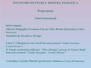 L’iniziativa, organizzata dal Museo Civico Archeologico “Girolamo Rossi”, dalla Sezione Intemelia dell’Istituto Internazionale di Studi Liguri e dal Comune di Ventimiglia, in collaborazione con il Centro Studi Interuniversitario “Guido Gozzano-Cesare Pavese” di Torino, unirà un incontro di studio e una mostra tematica per celebrare mezzo secolo dell’inserto letterario de La Stampa e ricordare la figura dello scrittore ventimigliese Nico Orengo, che ne fu per anni responsabile.