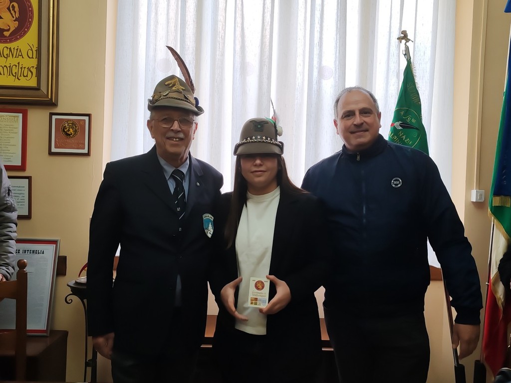Un riconoscimento voluto dal gruppo Ana Ten. Beppe Cumina per dire alla giovane penna nera: 'benvenuta nella grande famiglia alpina'. L'alpina ventimigliese, conclusa la scuola alberghiera ad Arma di Taggia, ha, infatti, partecipato al bando di concorso per entrare nell'esercito. Dopo undici settimane di addestramento alla scuola militare di Aosta e una in Abruzzo, finalmente riceve il cappello alpino con la penna nera, simbolo di appartenenza alle truppe alpine, a L'Aquila e, poi, viene assegnata al VI Reggimento Alpini di Brunico sulle Dolomiti.
