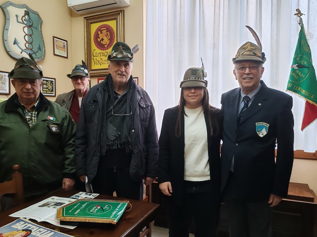Il gruppo alpini di Ventimiglia consegna un crest e un gagliardetto alla giovane penna nera Chiara Perini. La cerimonia si è svolta in mattinata a Ventimiglia.