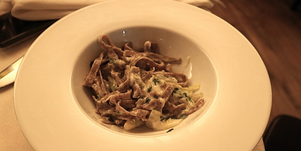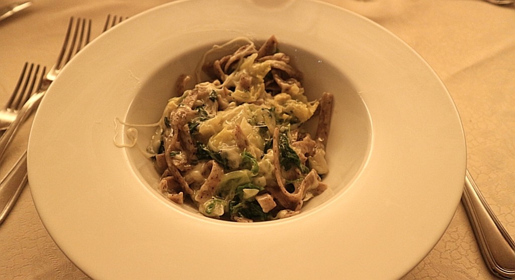 A seguire, un primo piatto irrinunciabile: i pizzoccheri, proposti nella versione più fedele alla tradizione, con verze, patate, burro e una generosa quantità di formaggi Casera e Latteria, eccellenze casearie della valle.