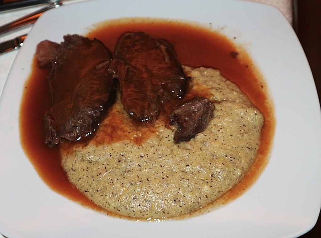 Il secondo piatto ha celebrato i sapori intensi dell’alta quota: il Ganassino, guanciale cotto a bassa temperatura, morbido e aromatico, servito con l’immancabile polenta taragna, cremosa e avvolgente.