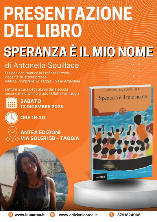 Sabato 13 Dicembre, alle ore 16,30, presso la libreria Antea Edizioni, in via Soleri 5B a Taggia verrà presentato il nuovo lavoro dell’autrice sanremese, Antonella Squillace, “Speranza è il mio nome”, Ed. Leucotea. Al suo quarto romanzo a carattere storico, la professoressa Squillace in questo libro vuole porre l’obiettivo su volti e storie dei tanti migranti, soprattutto minori non accompagnati che attraversano le nostre città e che spesso ci accontentiamo di conoscere solo attraverso statistiche e numeri.