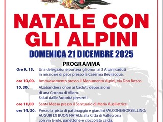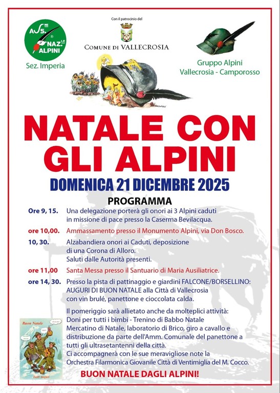 "Natale con gli alpini" a Vallecrosia. Una giornata di ricordo, festa e divertimento verrà proposta domenica 21 dicembre dai gruppi alpini di Vallecrosia e Camporosso con il patrocinio del Comune.