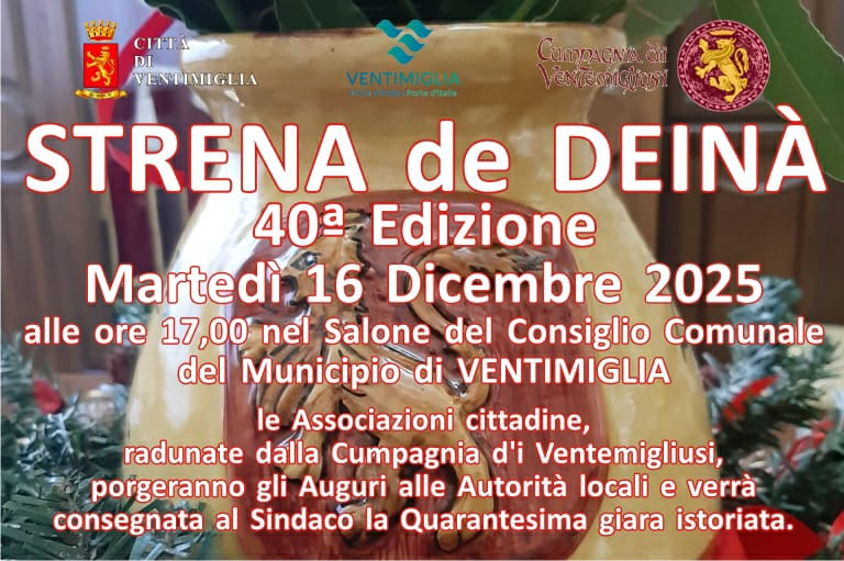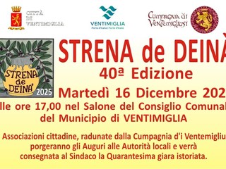 Torna la 'Strena de deinà' a Ventimiglia. Nell’aula consiliare del Comune martedì 16 dicembre alle 17 si svolgerà la quarantesima edizione della tradizionale cerimonia dello scambio degli auguri tra le associazioni cittadine, radunate dalla Cumpagnia d'i Ventemigliusi, e l'Amministrazione comunale.