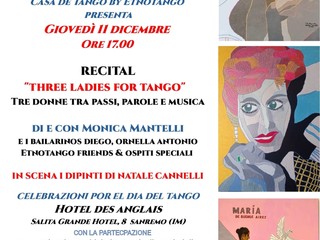 L'evento, proposto dalla Casa de tango by Etnotango con il patrocinio del Consolato Argentino di Milano, prevede un recital dal titolo 'Three ladies for tango', tre donne tra passi, parole e musica di e con Monica Mantelli, esperta di cultura rioplatense e direttrice artistica della rassegna, e i bailarinos di Etnotango friends Diego, Ornella e Antonio e ospiti speciali.