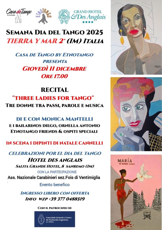 L'associazione nazionale carabinieri sezione Fois di Ventimiglia parteciperà all'evento benefico, a ingresso libero con offerta, in programma oggi pomeriggio, giovedì 11 dicembre, alle 17 all'hotel Des Anglais a Sanremo in occasione della Semana Dia del Tango 2025 nell'ambito della seconda edizione della rassegna "Tierra y Mar".