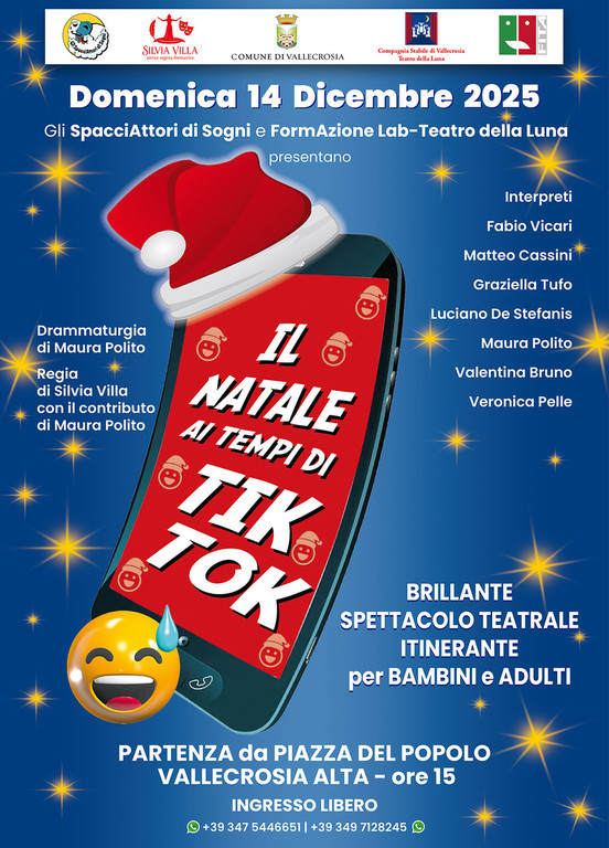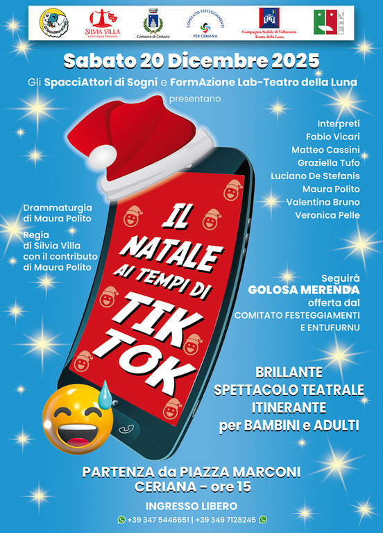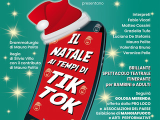 "Il Natale ai tempi di Tik Tok" sbarca a Ventimiglia e a Vallecrosia. Nel fine settimana il brillante spettacolo teatrale itinerante, rivolto a bimbi e adulti, andrà in scena nei giardini comunali Tommaso Reggio della città di confine, sabato 13 dicembre alle 15, e nel centro storico della città della famiglia, domenica 14 dicembre.