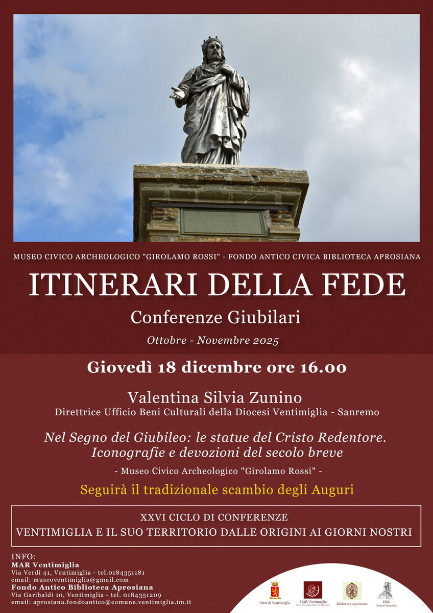Nell'occasione la Direttrice dell'Ufficio Beni Culturali della Diocesi di Ventimiglia–Sanremo Valentina S. Zunino, interverrà con la conferenza Nel segno del Giubileo: le statue del Cristo Redentore. Iconografie e devozioni del secolo breve. Ultimo appuntamento col ciclo “Ventimiglia e il suo territorio dalle origini ai giorni nostri”, giunto alla sua ventiseiesima edizione, che prosegue nella sua “missione” di divulgare le ultime scoperte della ricerca archeologica, storica, d'archivio, di critica dell'arte e di approfondimento sul territorio del Ponente ligure e di Ventimiglia in particolare.