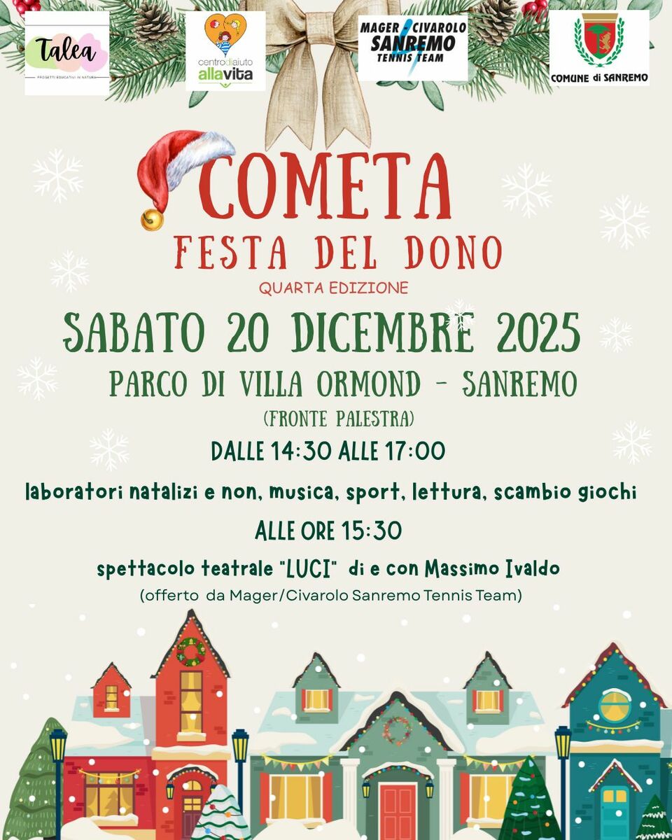 "L’evento - spiegano gli organizzatori - si svolgerà sabato 20 dicembre 2025, dalle 14.30 alle 17.00, presso il Parco di Villa Ormond a Sanremo (fronte palestra), e nasce con l’obiettivo di creare momenti di condivisione aperti a tutta la collettività, valorizzando il tempo trascorso insieme come dono autentico e prezioso. In un periodo dell’anno in cui il Natale richiama valori profondi come l’accoglienza, la solidarietà e la vicinanza, Cometa – Festa del Dono si propone come uno spazio inclusivo e accessibile, dove famiglie, bambini e cittadini di ogni età possano incontrarsi, partecipare e riscoprire il piacere dello stare insieme. Il pomeriggio sarà animato da laboratori natalizi e non, musica, sport, letture e momenti di scambio giochi, offrendo occasioni di socialità, creatività e partecipazione attiva. Alle ore 15.30 è inoltre previsto lo spettacolo teatrale 'LUCI', di e con Massimo Ivaldo, offerto dal Mager/Civarolo Sanremo Tennis Team.
