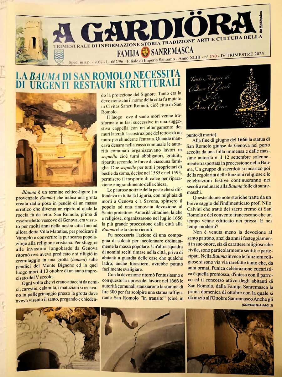 Tra i temi amministrativi di interesse generale affrontati, la Famija Sanremasca ha posto l’attenzione sulla necessità di urgenti interventi di restauro strutturale della storica “Bauma”, la chiesetta in cui San Romolo, patrono della città, si ritirò in eremitaggio e dove morì il 13 ottobre di un anno imprecisato del V secolo. Il luogo, ancora oggi meta di pellegrinaggi, versa infatti in condizioni che richiedono interventi non più rinviabili. A questo proposito, la Famija ha annunciato l’intenzione di avviare una sottoscrizione per contribuire al finanziamento dei lavori di restauro, per i quali sarà richiesta la necessaria autorizzazione alla Curia Vescovile.
