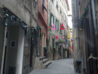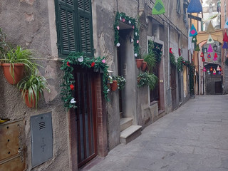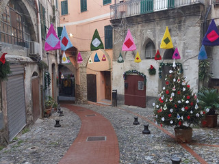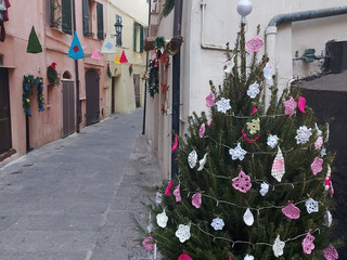 Addobbi realizzati all'uncinetto abbelliscono il centro storico di Ventimiglia in occasione delle festività natalizie.