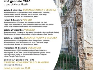 Il calendario proseguirà sabato 27 dicembre con una seconda visita a Bussana nuova e vecchia, mercoledì 31 a Coldirodi, domenica 4 gennaio al cimitero monumentale della Foce, lunedì 5 a Palazzo Bellevue e martedì 6 con l’incontro “Sanremo rossosangue”.