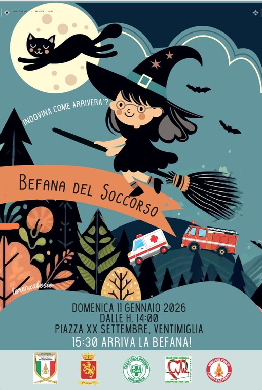 L'arrivo della Befana è previsto alle 15.30. "Dalle 14 alle 17 vi aspettiamo in piazza XX Settembre a Ventimiglia per un pomeriggio di divertimento" - fanno sapere gli organizzatori - "Sono previsti l’ambulanza dei pupazzi-percorso, Pompieropoli, dimostrazioni di disostruzione pediatrica tenuta dai nostri istruttori-mezzi dei vigili del fuoco e ambulanze in esposizione dove sarà possibile far salire i bimbi per fare delle foto. Alle 15:30 arriverà la Befana, ma come arriverà?? Questo non ve lo sveliamo sarà una sorpresa. Verrà, inoltre, distribuita cioccolata calda da parte degli scout. Bimbi e famiglie vi aspettiamo".