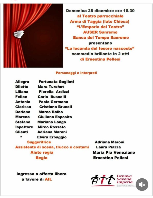 Domenica 28 dicembre, infatti, l’Emporio del Teatro porterà in scena la commedia brillante “La locanda del tesoro nascosto”, scritta e diretta da Ernestina Pellesi, autrice e regista che da anni anima la scena teatrale locale con testi vivaci, ironici e ricchi di umanità.