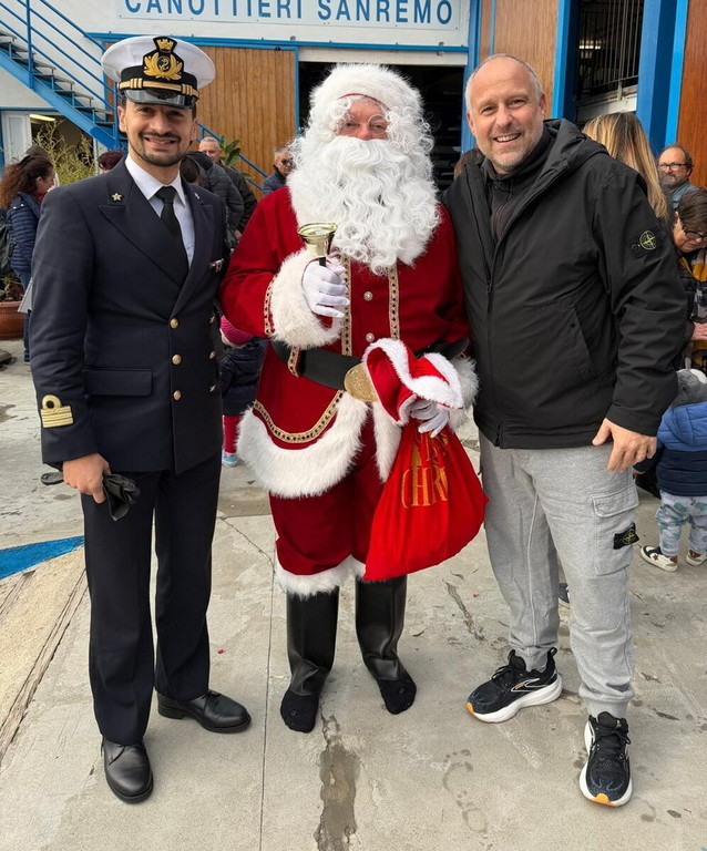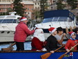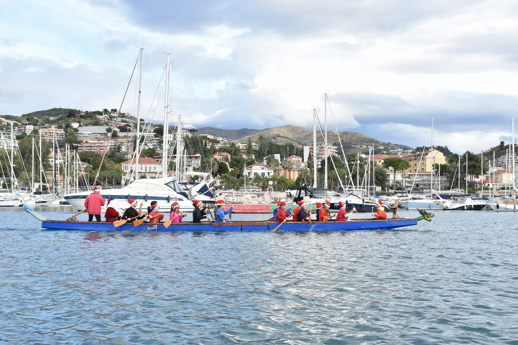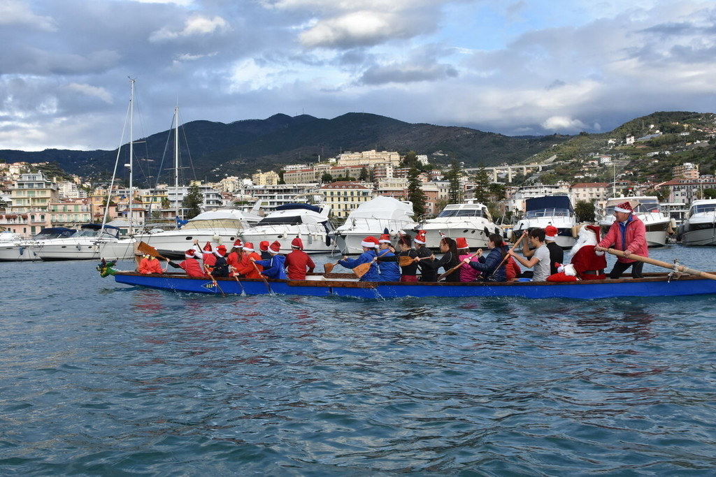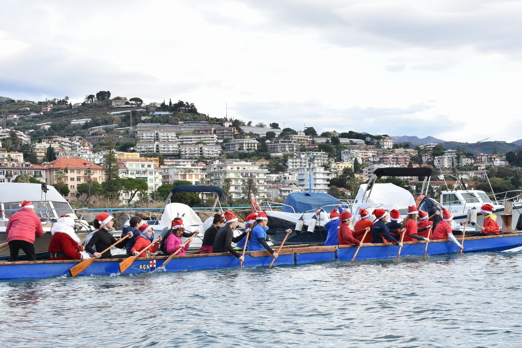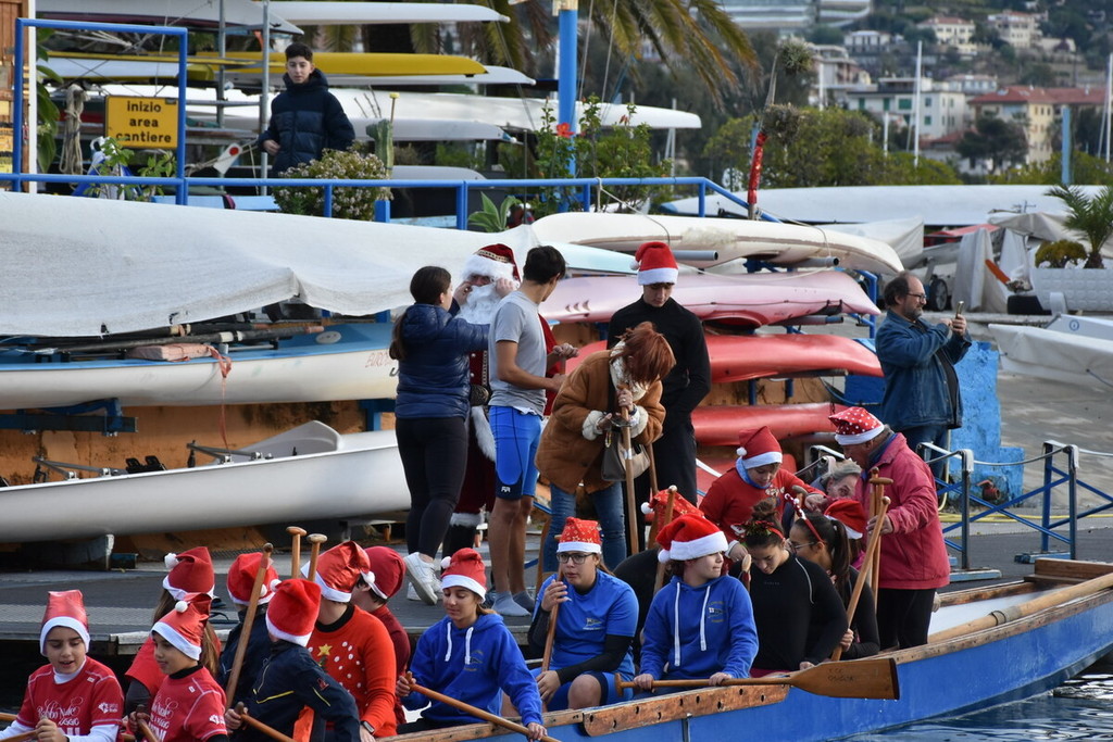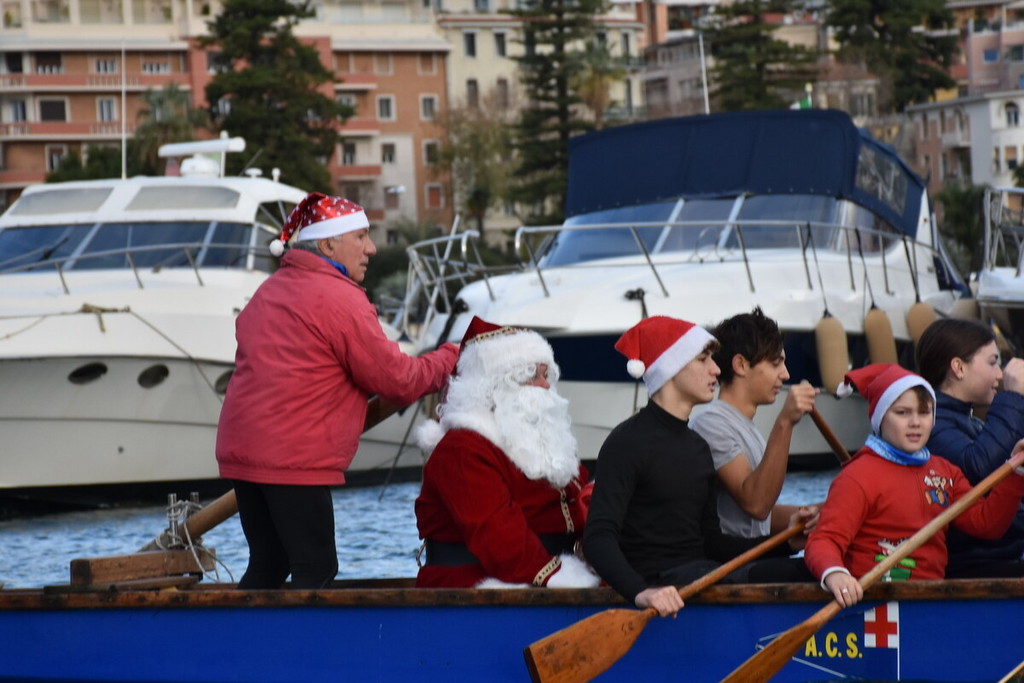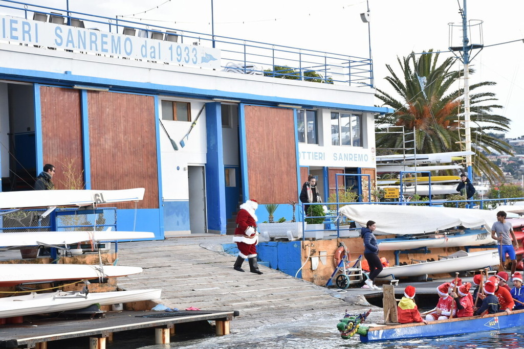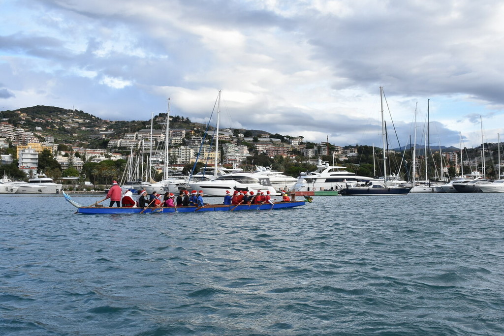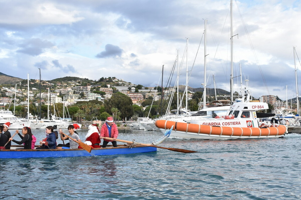 Tanti atleti della Canottieri Sanremo su una imbarcazione speciale, capitanati dal ‘Babbo Natale’ vestito di tutto punto e con un sacco pieno di dolci e caramelle. Sono partiti alle 9.30, scortati da un natante e dalla motovedetta della Guardia Costiera, facendo un giro tra il porto vecchio e Portosole.