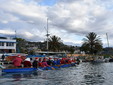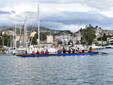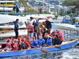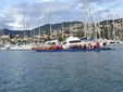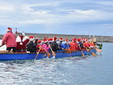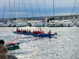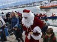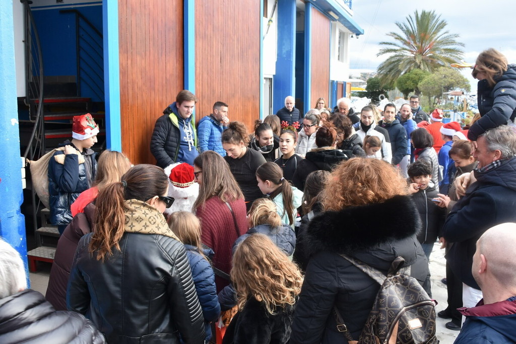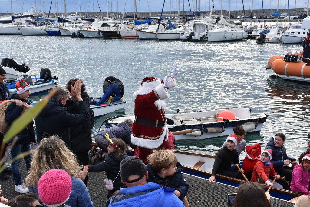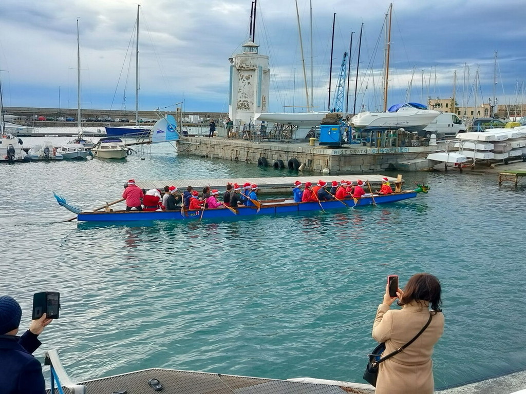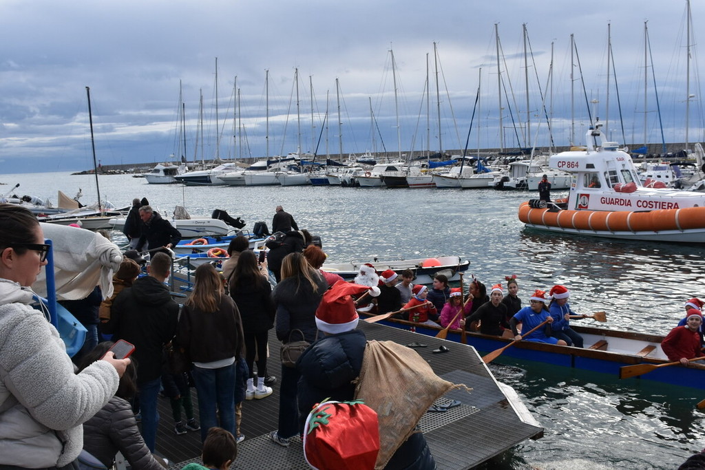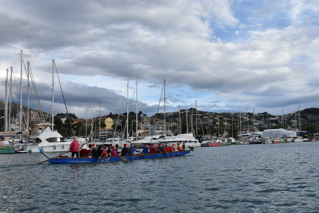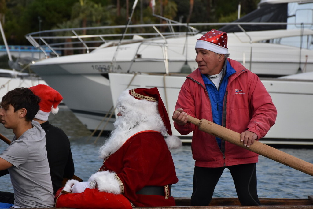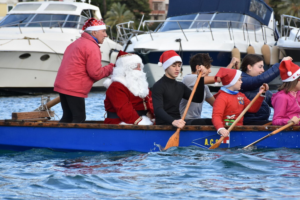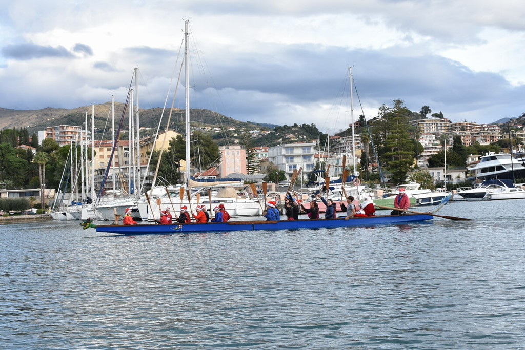 Tanti atleti della Canottieri Sanremo su una imbarcazione speciale, capitanati dal ‘Babbo Natale’ vestito di tutto punto e con un sacco pieno di dolci e caramelle. Sono partiti alle 9.30, scortati da un natante e dalla motovedetta della Guardia Costiera, facendo un giro tra il porto vecchio e Portosole.