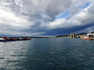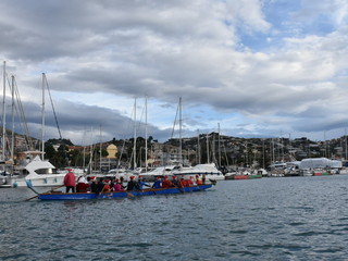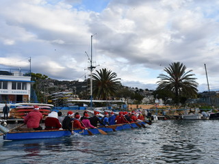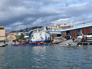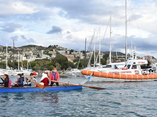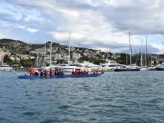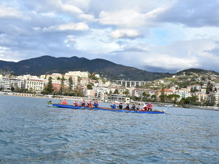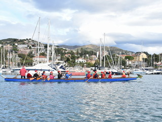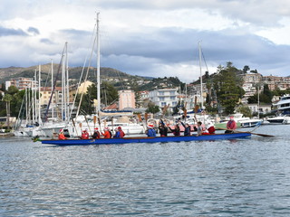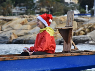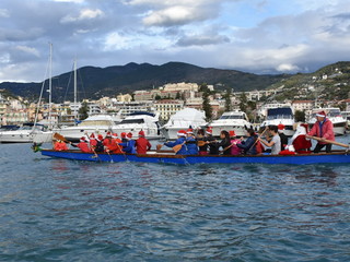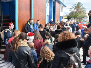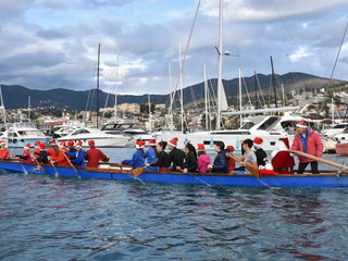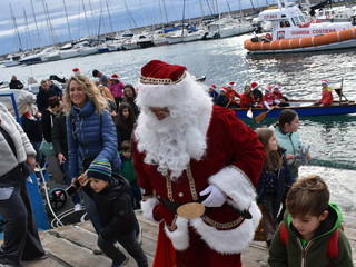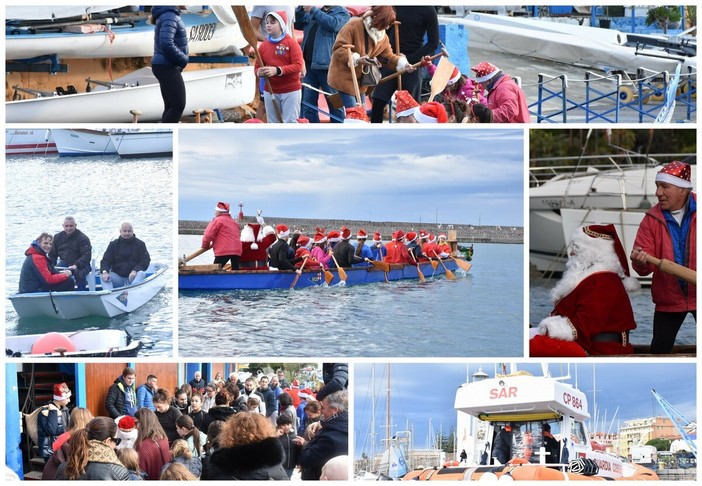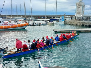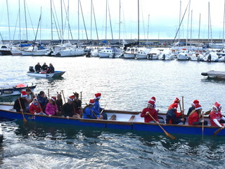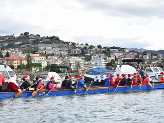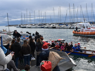 Tanti atleti della Canottieri Sanremo su una imbarcazione speciale, capitanati dal ‘Babbo Natale’ vestito di tutto punto e con un sacco pieno di dolci e caramelle. Sono partiti alle 9.30, scortati da un natante e dalla motovedetta della Guardia Costiera, facendo un giro tra il porto vecchio e Portosole.