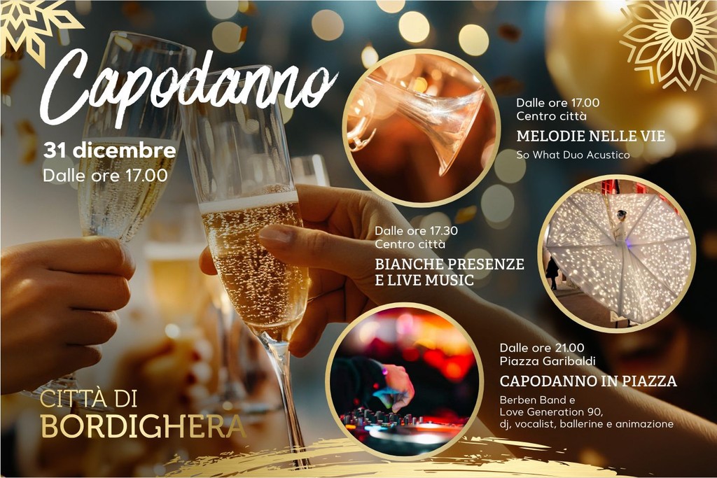 Il 31 dicembre dalle 17 vi sarà musica dal vivo tra le vie del centro con Melodie nelle Vie, dalle 17.30 sono previste performance e atmosfere luminose con Bianche Presenze & Live Music, uno spettacolo itinerante che unirà l'eleganza di Bianche Farfalle con costumi luminosi alla magia unica creata dal vivo, mentre dalle 21 vi sarà la grande festa in piazza Garibaldi con dj set e live show di Berben Band e Live Generation 90 in attesa della mezzanotte per un brindisi collettivo sotto il cielo di Bordighera. Per la prima volta, però, non saliranno sul palco né il sindaco né l'amministrazione comunale per condividere il magico momento con la cittadinanza a causa dello scioglimento del consiglio comunale dovuto alla sfiducia al sindaco firmata da nove consiglieri, sia di maggioranza che di minoranza.