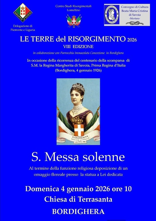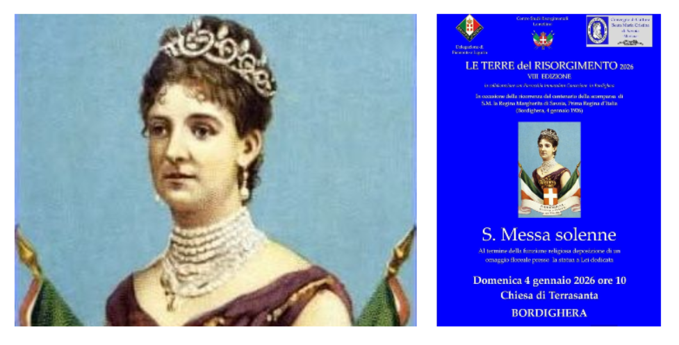 Bordighera ricorda la Regina Margherita. Domenica 4 gennaio alle 10 nella chiesa di Terrasanta verrà celebrata una santa messa solenne in occasione della ricorrenza del centenario della scomparsa della regina Margherita di Savoia, prima regina d'Italia, avvenuta il 4 gennaio 1926 nella città delle palme.