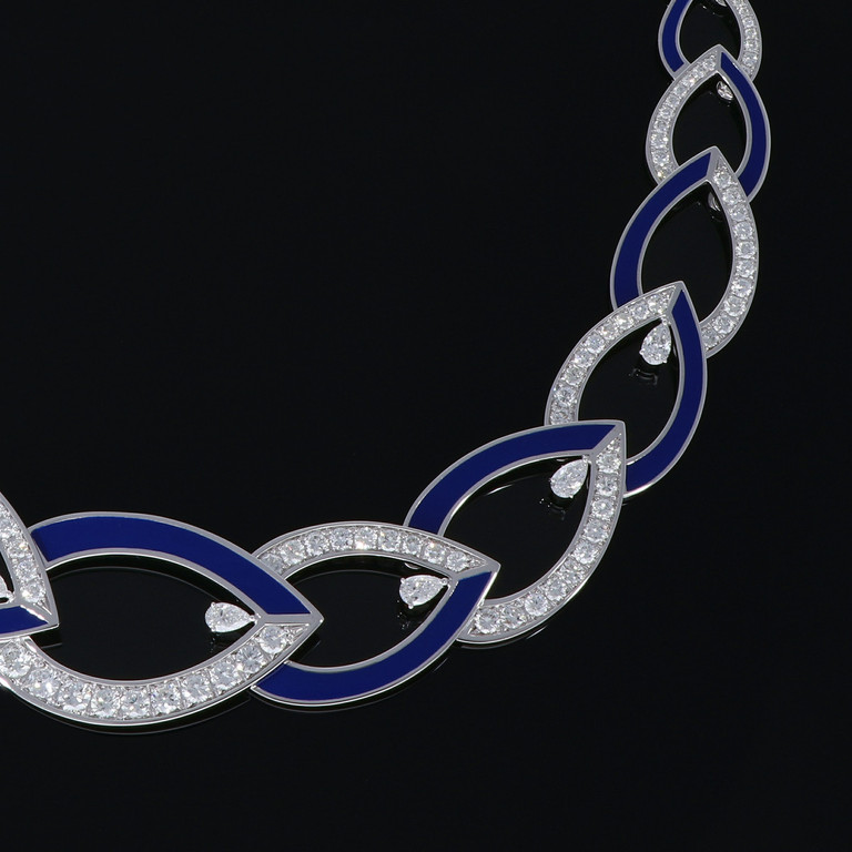 Il design si fonda su un raffinato dialogo visivo tra la luminosità di oltre 250 diamanti taglio brillante e un profondo blu cobalto, un intreccio che percorre l’intera struttura con ritmo armonico. La principale fonte d’ispirazione è la forma della goccia, reinterpretata in proporzioni e orientamenti molteplici fino a diventare il motivo dominante dell’opera.